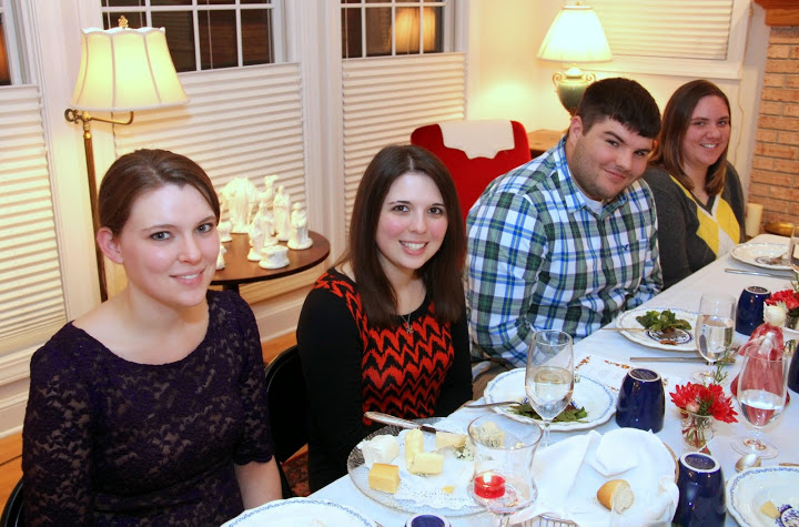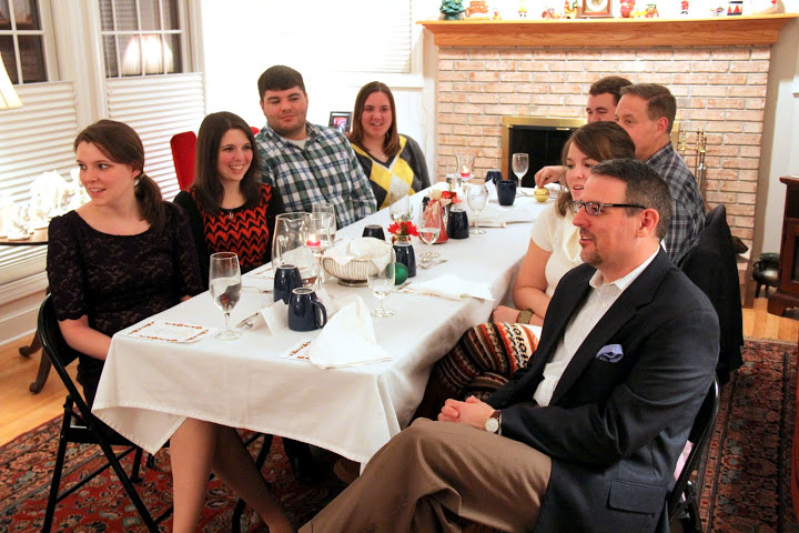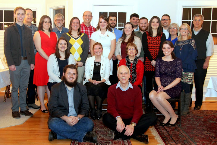 Participants in the 11th Annual Phi Alpha Theta/History Department French Christmas Dinner on December 6, 2014, pose for a photo at the beginning of the evening. They are: (sitting on the floor, left to right) Nick Hancock and Dr. Stephen Carls; (seated on chairs, left to right) Jordan Sellers, Hannah Jones, Becky LIndley, and Savannah German; (standing, left to right) Nathan Handley, Dr. Henry Allen, Faith Bagley, Dr. Terry Lindley, Kensie Zills, Robert Briley, Sarah Carroll, Allen Bradley, Bethany Evans, Jordan Haskins, Kenton Evans, Caitlin Roach, Dr. Keith Bates, Nancy Thomas, Brenda Briley, and Dr. David Thomas. Dr. Alice-Catherine, the dinner hostess, took the photo.