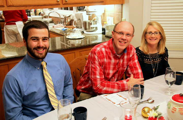 Nick Hancock (left to right), Dr. Henry Allen, and Sarah Carroll smile for the camera at the Phi Alpha Theta/History Department French Christmas dinner on December 6, 2014.