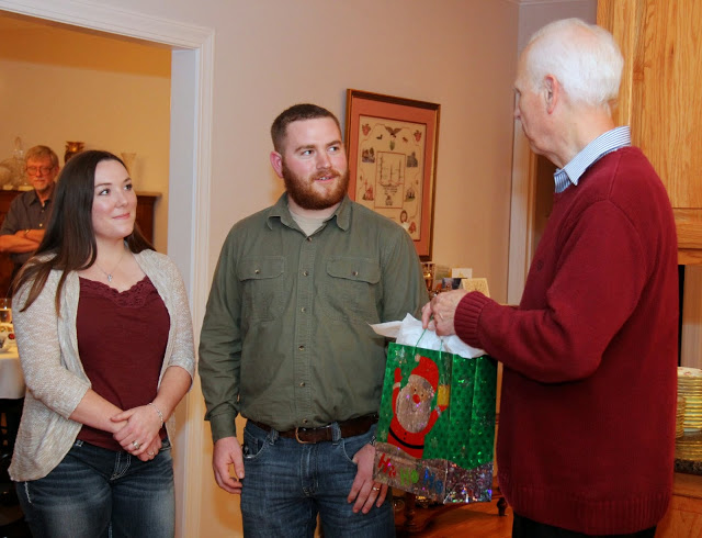 Dr. Stephen Carls (right) presents a graduation gift to history major Kenton Evans on December 6, 2014, while Evans' wife Bethany watches.