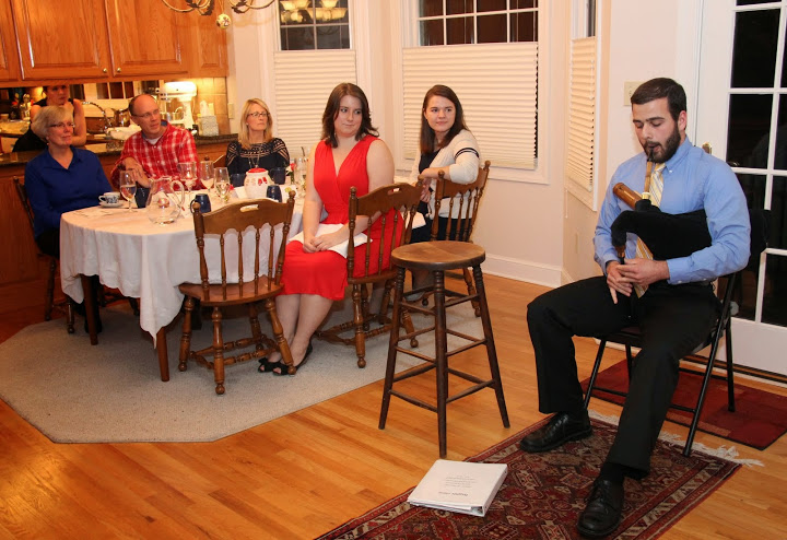 Phi Alpha Theta member Allen Bradley (right) plays a musical composition on his shuttle pipes during the annual Phi Alpha Theta/History Department French Christmas dinner on December 6, 2014. Seated at the table behind are: (starting on the left and going clockwise) Nancy Thomas, Robert Briley, Brenda Briley, Jordan Sellers, and Faith Bagley.