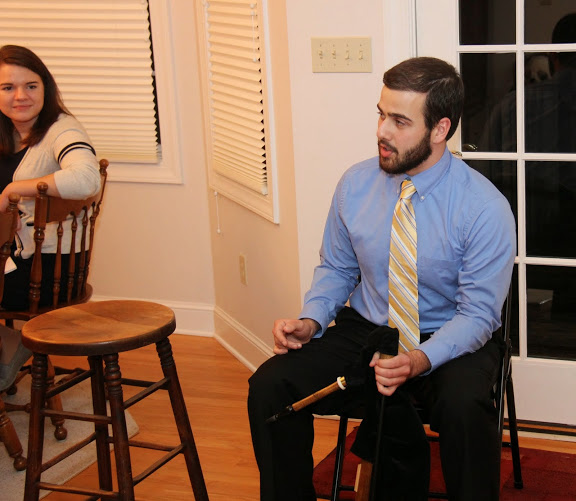 Allen Bradley answers a question about shuttle pipes during the Phi Alpha Theta/History Department French Christmas dinner on December 6, 2014. Jordan Sellers is in the background.