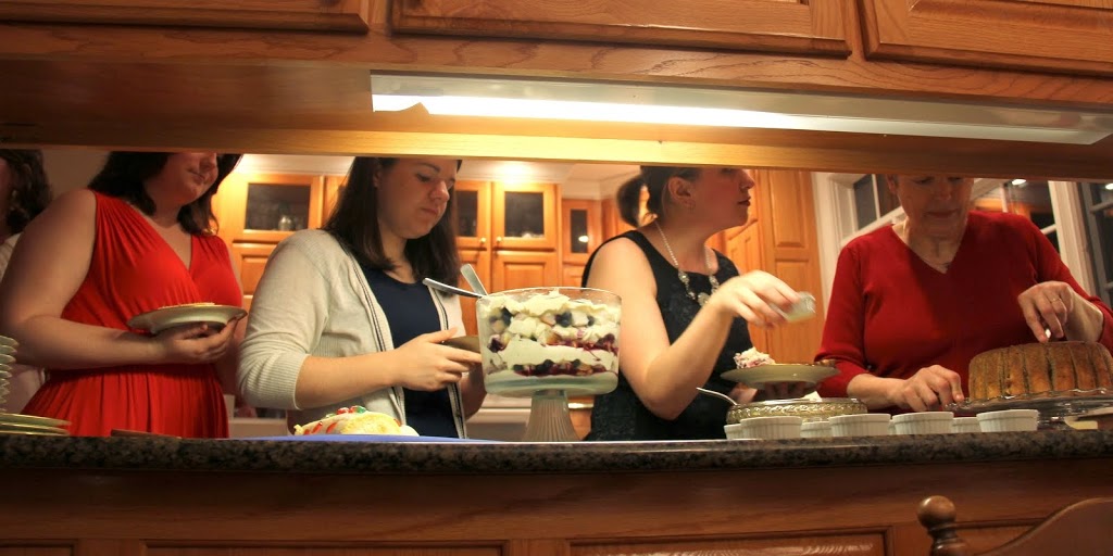 Attendees at the history department's Christmas dinner go through the dessert line while Dr. Alice-Catherine Carls (right) serves pieces of a Marquise au Chocolat cake. Those in line are: (left to right) Faith Bagley, Jordan Sellers, and Hannah Jones.
