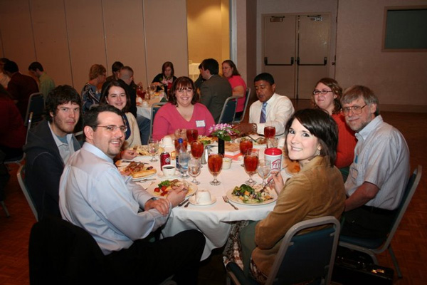 Members of the Delta-Psi Chapter’s contingent prepare to eat lunch at the regional conference. They are (clockwise beginning at the front left) Dr. Keith Bates, Brendon Kuhlman, Mary Thompson, Kathleen Cooper, William Woods, Nikki Henry, Dr. Terry Lindley, and Hannah Holliday.