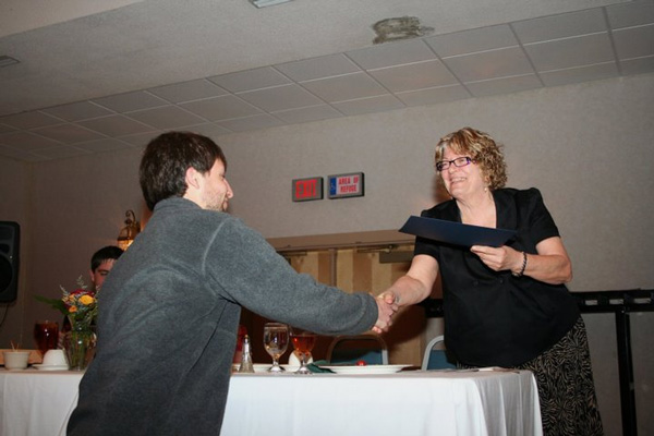 Cameron Armstrong receives congratulations from Dr. Donna Graves, the Phi Alpha Theta regional conference coordinator, for winning the best paper prize in “European History.”