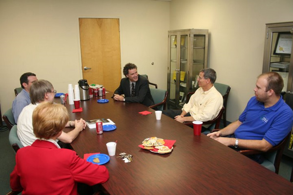 Dr. Edward Ayers relaxes with members of the history and political science departments during an afternoon coffee break on October 9.