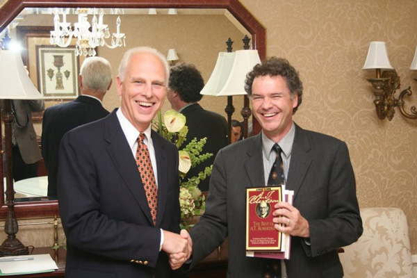 Dr. Stephen Carls presents two of Dr. David Dockery’s books to Dr. Edward Ayers at an evening dinner in Dr. Ayers’ honor on October 9.