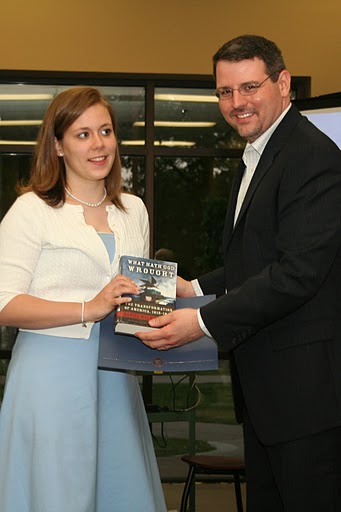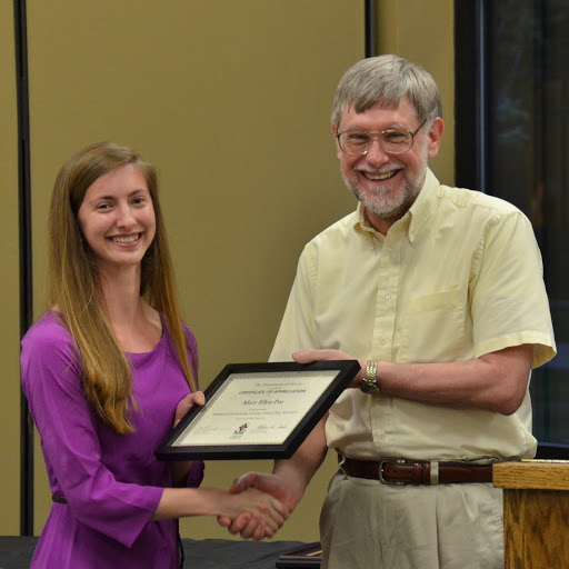 Dr. Keith Bates presents a certificate of commendation and a book to Olivia Winters at the history awards banquet on May 5, 2016, for the excellent paper that she presented at the Tennessee Phi Alpha Theta Regional Conference on April 2. Photo by MiKalla Cotton |