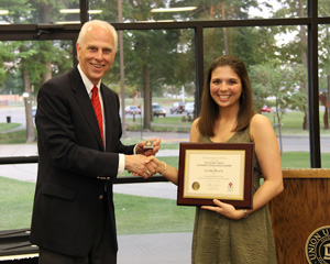 Dr. Henry Allen congratulates Lauren Geary at the department awards banquet on May 5, 2016, as he gives her the second place award in the Dr. James Alex Baggett History Research Paper Competition. Photo by MiKalla Cotton |