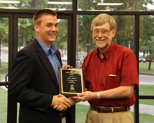 Dr. Stephen Carls (right) presents the History Alumni Distinguished Achievement Award to J. Jason Williams at the history awards banquet on May 5, 2016. Photo by MiKalla Cotton |