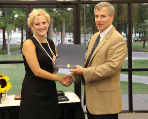 Dr. Terry Lindley presents a certificate of appreciation to Kathryn Mitchell at the history awards banquet on May 5, 2016, for her work as president of the Rutledge Honorary History Club in 2015-2016. Photo by MiKalla Cotton |