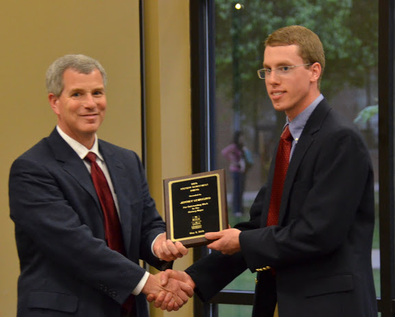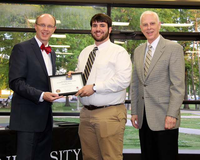 Dr. Stephen Carls (left) presents the first place award in the Dr. James Alex Baggett History Research Paper Competition to Seth Reid at Union University's Annual Awards Convocation on May 6, 2016. Photo by Kristi Woody |