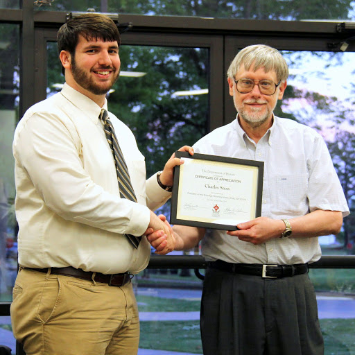 Dr. Stephen Carls (left) presents a certificate of appreciation to Nicholas Hancock at the history awards banquet on May 5, 2016, for his work as president of Phi Alpha Theta in 2015-2016. Photo by MiKalla Cotton |
