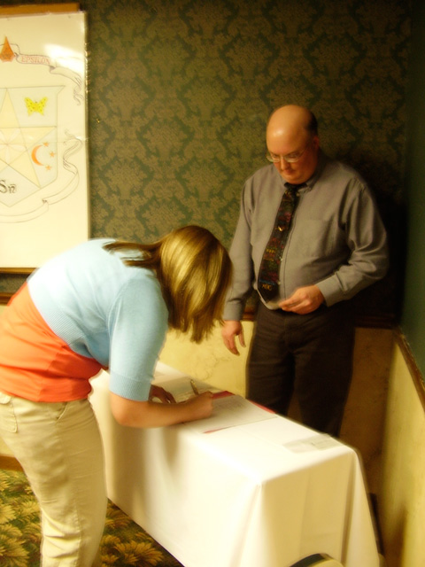 Peter Boedeker signs the chapter roll while Dr. Dawson prepares to present Peter his membership card