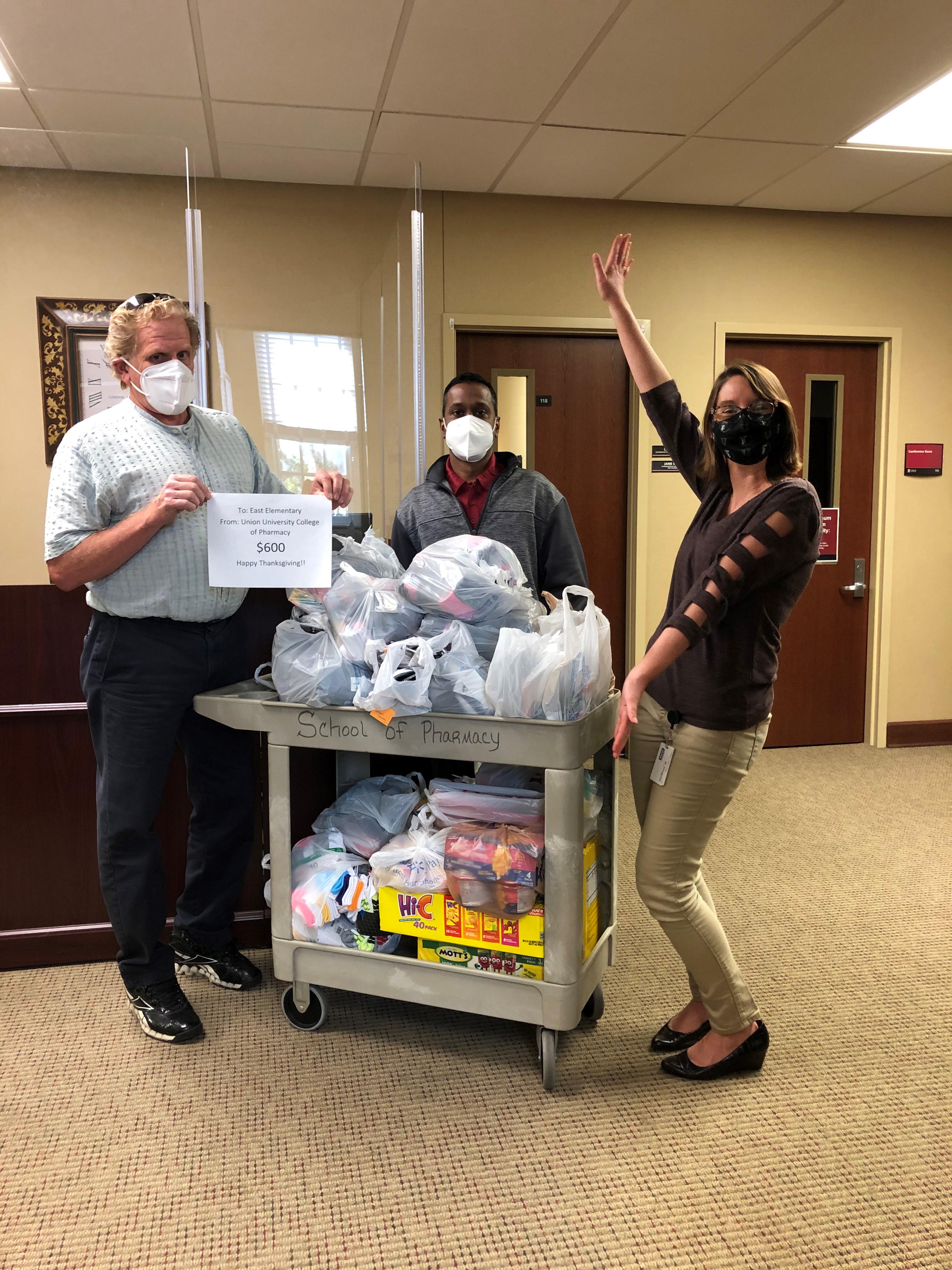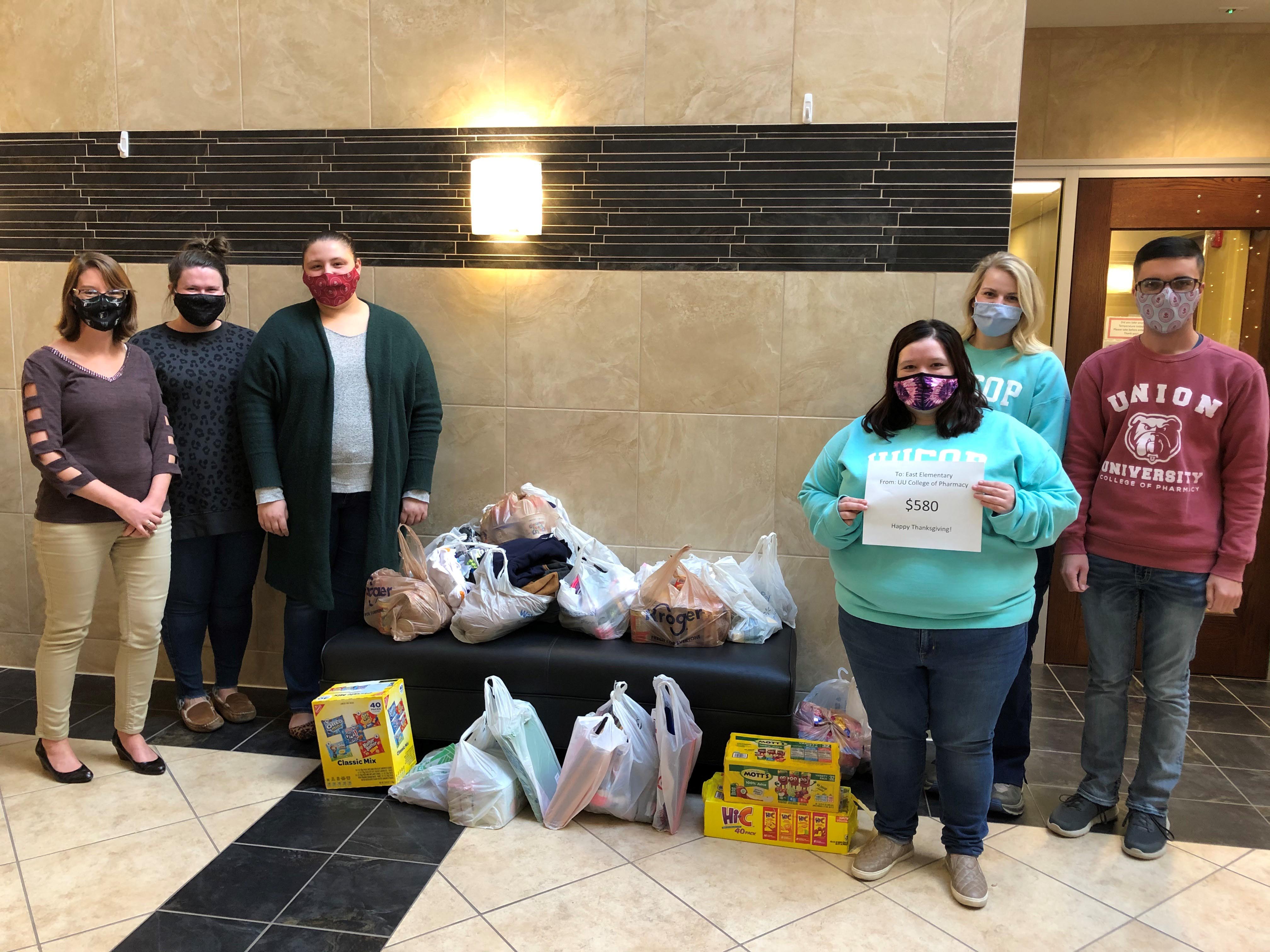 Nov 23, 2020 - Thanks to the creativity of the College of Pharmacy’s Missions and Community Outreach Committee Chair, Dr. Bethany Murphy, and the generosity of our COP pharmily, the COP raised enough money to provide ten Thanksgiving meals for local families affiliated with East Elementary School in Humboldt. The meals included a turkey, corn, beans, mashed potatoes, stuffing, macaroni and cheese, and chocolate cake for dessert. Additionally, the COP collected donations for weekend backpack meals, school supplies, and various clothing items and made a $250 donation to the Christmas Angel Tree project at the school. COP members worked together on this project as a part of the first annual Battle of the Student Orgs. Rho Chi won the competition, with 100% of membership making a donation. PLS finished in second place, with SCCP in third, followed very closely by SSHP in fourth place. All who donated were rewarded with a Christmas pajama day.