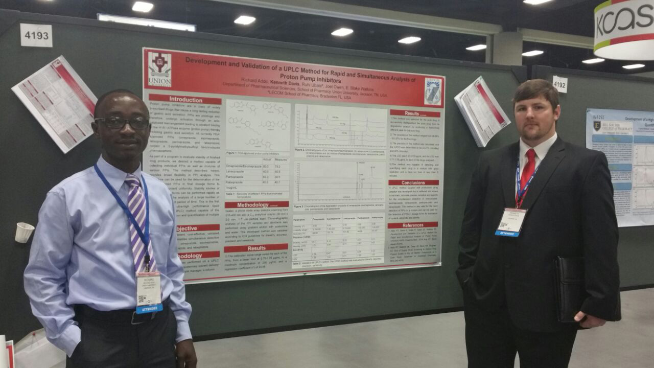 Dr. Addo got the opportunity to precept Mr. Kenneth (Rusty) Davis during his APPE rotation in his Research Lab. Their findings of their work was published in AAPS Pharm SciTech journal and subsequently was presented at the Annual AAPS meeting in San Diego in November 2014. The work was titled Development and Validation of a UPLC Method for Rapid and Simultaneous Analysis of Proton Pump Inhibitors.