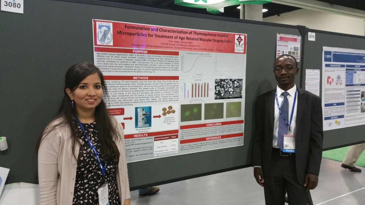 At the same meeting, our past Post-doctoral Fellow of Pharmaceutics, Dr. Ruhi Ubale also presented a project with the mentor Dr. Addo on Formulation and Characterization of Thymoquinone-Loaded Microparticles for Treatment of Age Related Macular Degeneration.